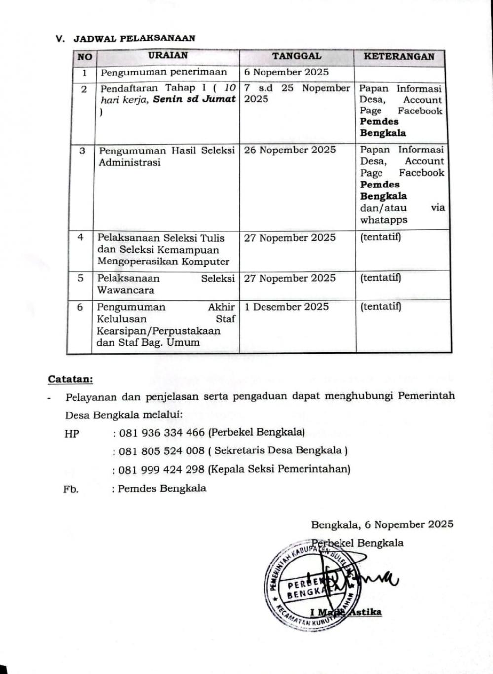 Hp. 081805524008 (Sekretaris Desa Bengkala) Hp. 081999424298 (Kepala Seksi Pemerintahan Desa Bengkala)