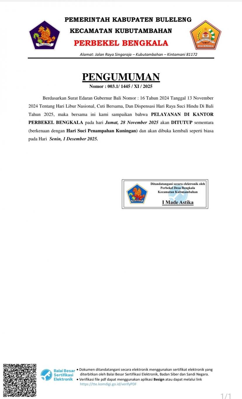 maka bersama ini kami sampaikan bahwa PELAYANAN DI KANTOR PERBEKEL BENGKALA pada hari Jumat, 28 November 2025 akan DITUTUP sementara (berkenaan dengan Hari Suci Penampahan Kuningan)