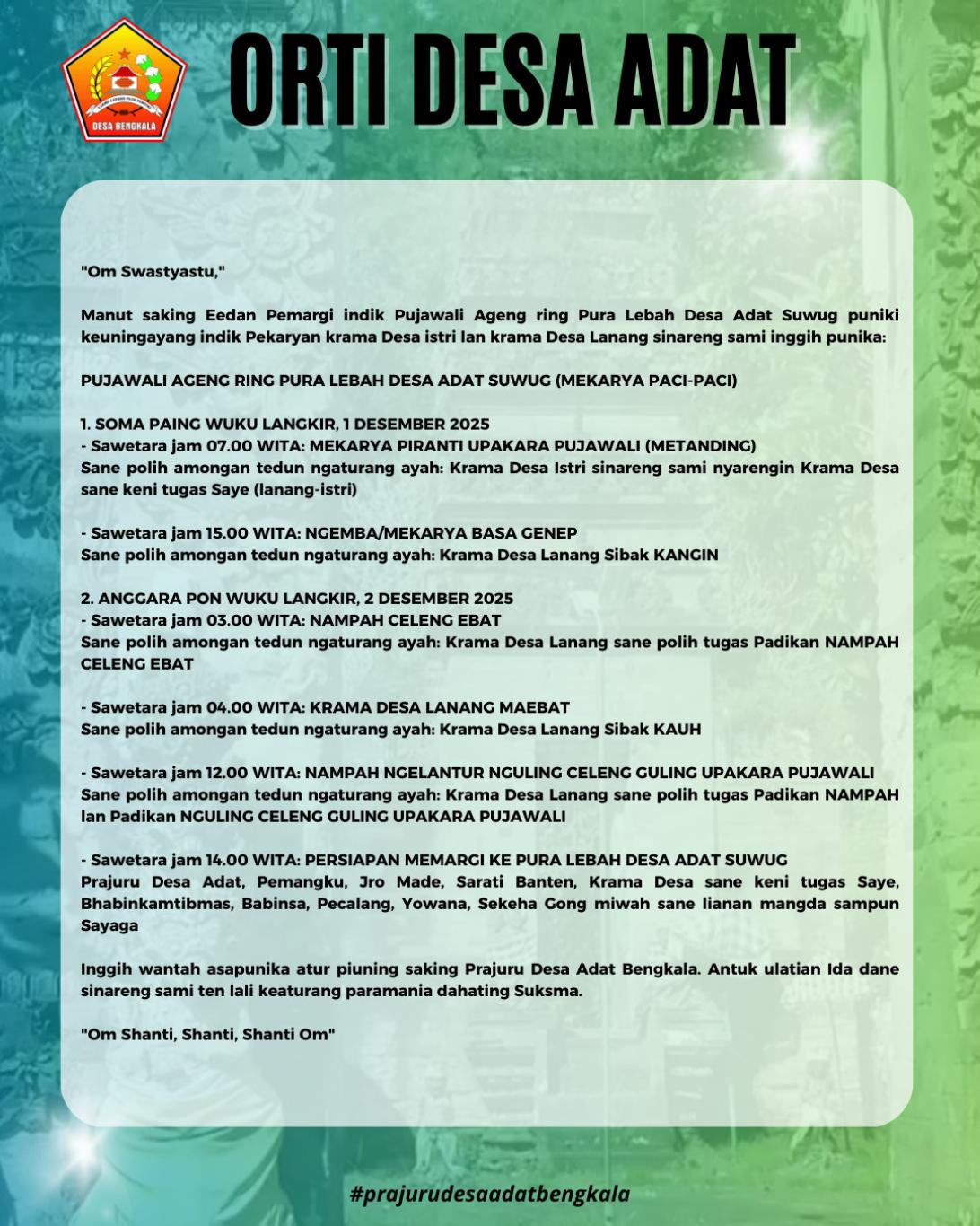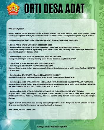 Inggih wantah asapunika atur piuning saking Prajuru Desa Adat Bengkala. Antuk ulatian Ida dane sinareng sami ten lali keaturang paramania dahating Suksma.