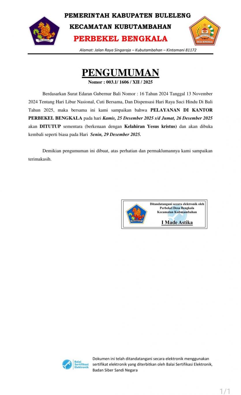 maka bersama ini kami sampaikan bahwa PELAYANAN DI KANTOR PERBEKEL BENGKALA pada hari Kamis, 25 Desember 2025 s/d Jumat, 26 Desember 2025 akan DITUTUP sementara