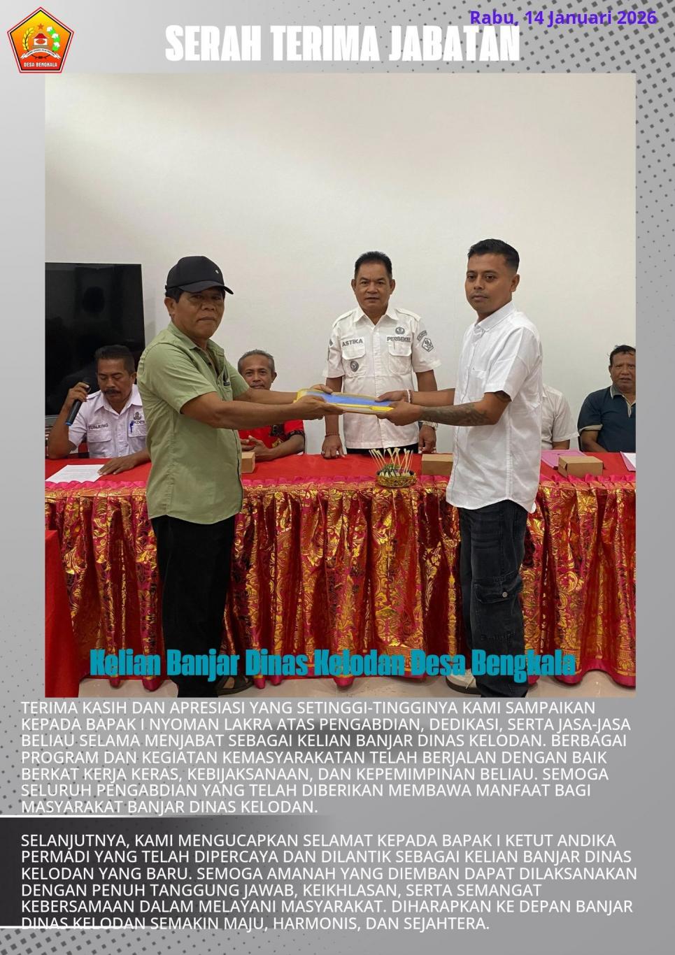 mari kita bersama-sama mendukung dan bekerja sama dengan Kelian Banjar Dinas Kelodan yang baru demi kelancaran roda pemerintahan dan kemajuan Desa Bengkala.