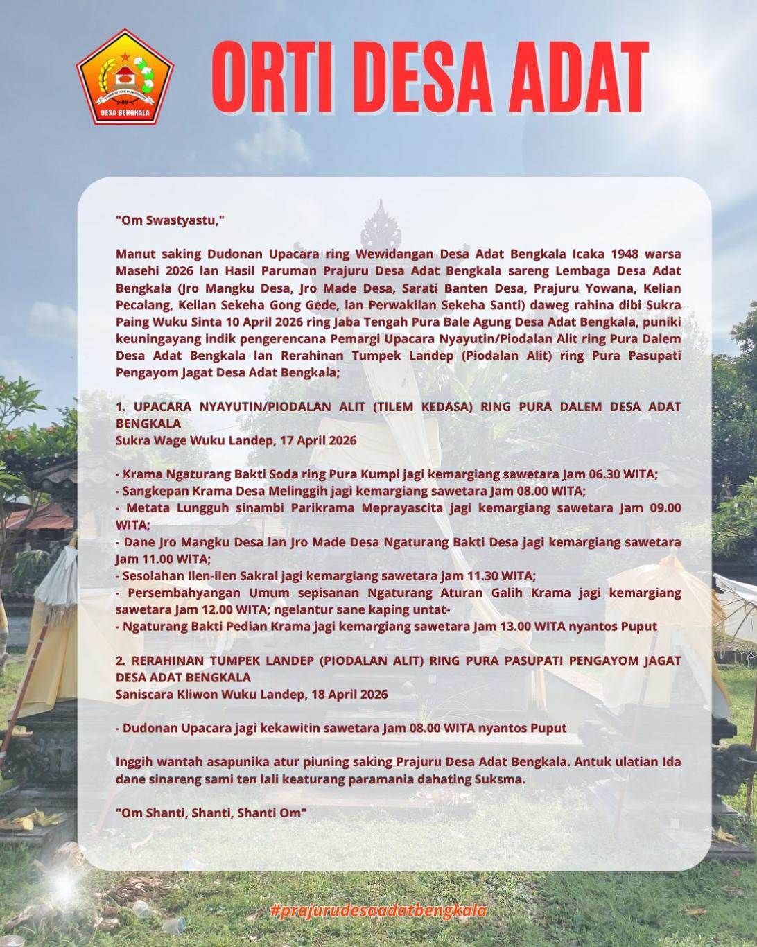 Manut saking Dudonan Upacara ring Wewidangan Desa Adat Bengkala Icaka 1948 warsa Masehi 2026 lan Hasil Paruman Prajuru Desa Adat Bengkala sareng Lembaga Desa Adat Bengkala (Jro Mangku Desa, Jro Made Desa, Sarati Banten Desa, Prajuru Yowana, Kelian Pecalang, Kelian Sekeha Gong Gede, lan Perwakilan Sekeha Santi) daweg rahina dibi Sukra Paing Wuku Sinta 10 April 2026 ring Jaba Tengah Pura Bale Agung Desa Adat Bengkala, puniki keuningayang indik pengerencana Pemargi Upacara Nyayutin/Piodalan Alit ring Pura Dalem Desa Adat Bengkala lan Rerahinan Tumpek Landep (Piodalan Alit) ring Pura Pasupati Pengayom Jagat Desa Adat Bengkala;